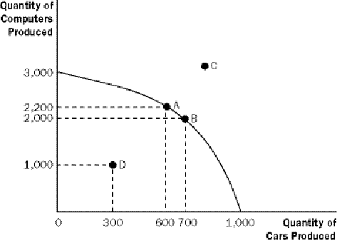 3. Because resources are scarce, not every combination of computers and cars is possible. Production at a point outside of the curve (such as C) is not possible given the economy’s current level of resources and technology.