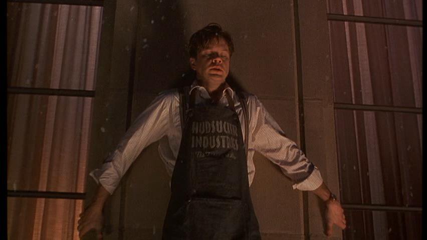 The circle is a symbol that is very important to the story. Although ordinarily symbolic stuff in films is particularly to find on a first viewing, in Hudsucker the imagery is apparent. It is in the coffee stain on a newspaper that leads Barnes to Hudsucker Industries, the circular clock that is a prominent feature on the front of their building, in the gears that drive the clock (seen in two key scenes), in an angel's halo, and in the product idea that becomes Barnes' downfall. It's all over the place. The story is even circular, beginning at the end and looping around to tell the complete story. There's even a dash of Christian symbolism thrown in toward the very end, during a fight that reveals a cross and two characters who represent God and Satan fighting over the outcome of Norville Barnes.